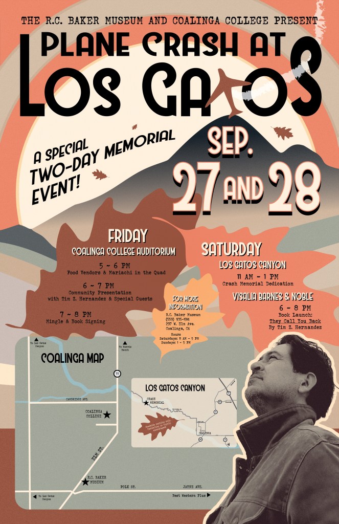 9/27/24, 6-8pm, Coalinga College, Auditorium, Reading & Signing, Coalinga, CA. This event is in partnership with the Los Gatos Canyon Memorial event tomorrow.